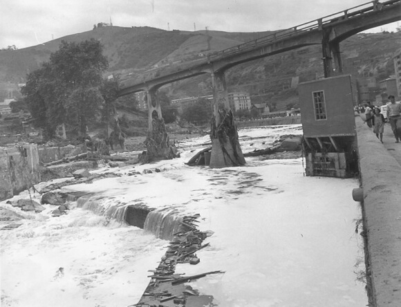 La antigua isla de San Cristóbal, a la altura del barrio de La Peña, desapareció gracias al agua. No fue engullida por el Nervión, pero sí sucumbió a su ira. Tras las inundaciones de 1983, que anegaron la parte baja de Bilbao, el Ayuntamiento acometió varias remodelaciones en el cauce que hizo variar el curso de las aguas y de la reciente historia de la ciudad