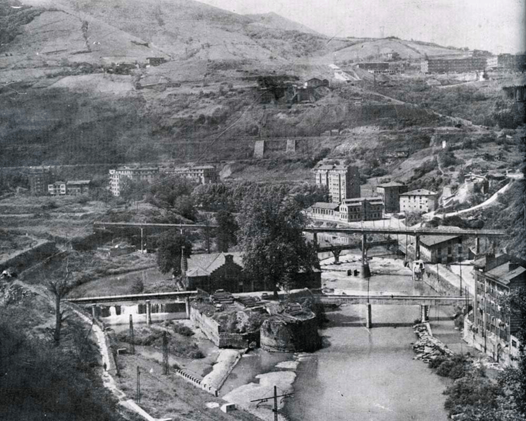 La foto es de una pasarela que está río abajo y que estaba junto a la desaparecida isla de San Cristobal (árboles de la izquierda), hoy más o menos calle Zamakola 72-74. de hecho, hoy todavía existe la separación entre ambos bloques de viviendas porque ahí iba a parar la citada pasarela (o puente, como le queramos llamar).